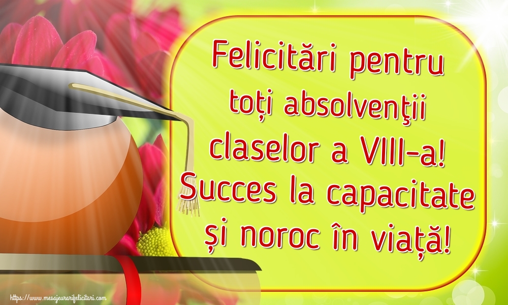 Felicitări pentru toți absolvenţii claselor a VIII-a! Succes la capacitate și noroc în viață! Felicitari si imagini de Ultimul clopoţel - Sfârșitul Anului Școlar pentru clasa a VIII-a.