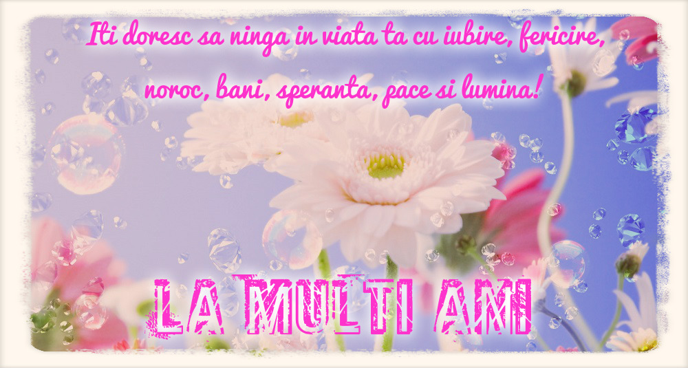 Iti doresc sa ninga in viata ta cu iubire, fericire, noroc, bani, speranta, pace si lumina! La multi ani!