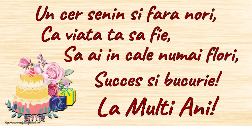 Un cer senin si fara nori, Ca viata ta sa fie, Sa ai in cale numai flori, Succes si bucurie! La Multi Ani! ~ tort și cadouri