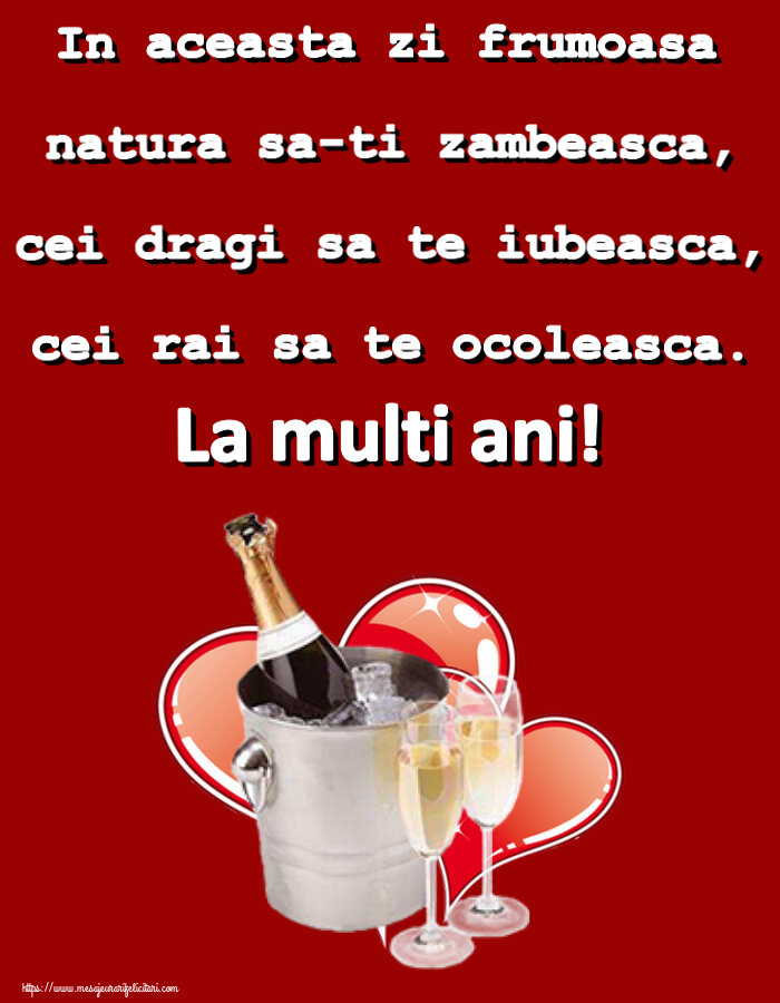 In aceasta zi frumoasa natura sa-ti zambeasca, cei dragi sa te iubeasca, cei rai sa te ocoleasca. La multi ani! ~ șampanie și inimioare