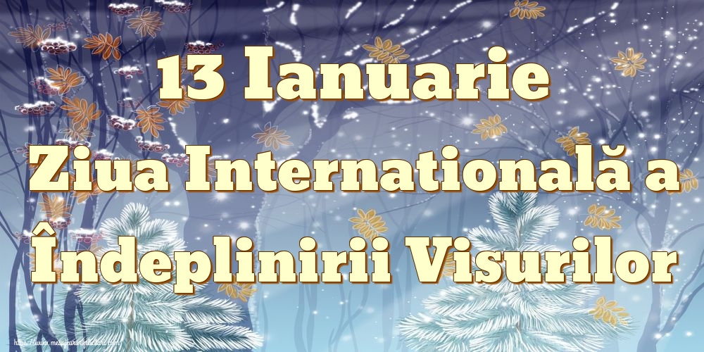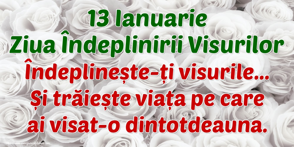 13 Ianuarie Ziua Îndeplinirii Visurilor Îndeplinește-ți visurile... Și trăiește viața pe care ai visat-o dintotdeauna. Felicitari si imagini de Ziua Internatională a Îndeplinirii Visurilor - 13 Ianuarie.