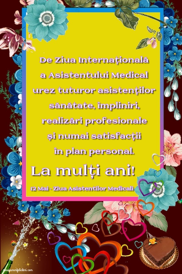 De Ziua Internațională a Asistentului Medical urez tuturor asistenților sănătate, împliniri, realizări profesionale și numai satisfacții în plan personal. La mulți ani! 12 Mai - Ziua Asistentilor Medicali