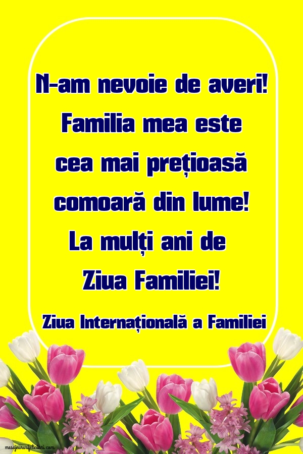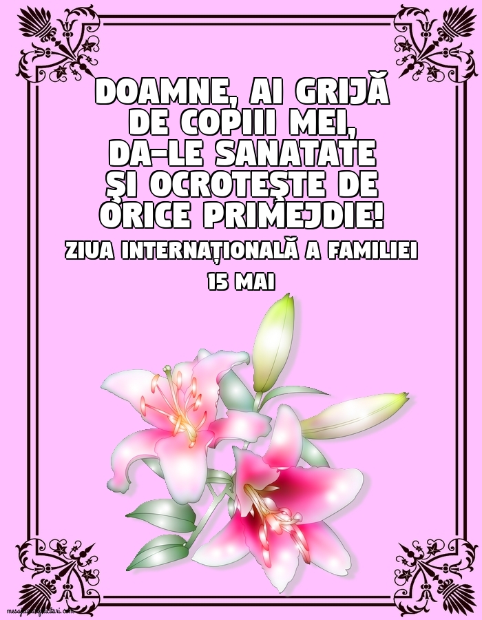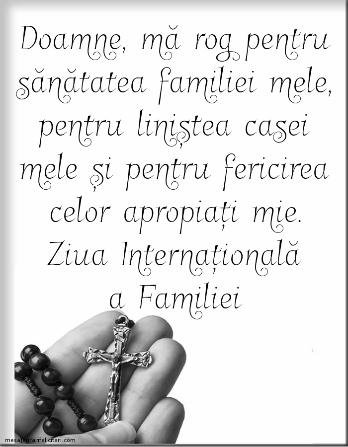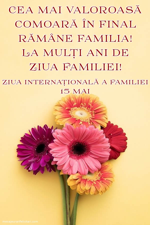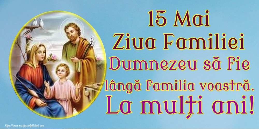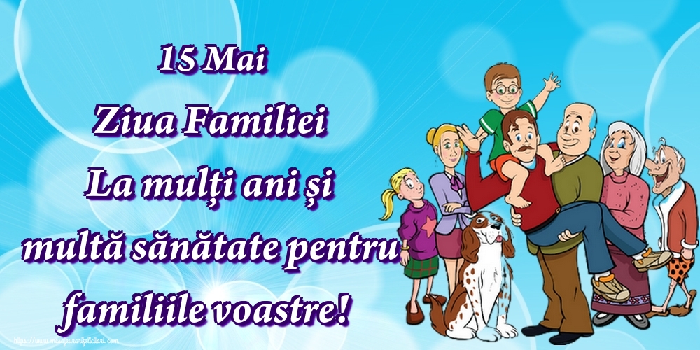 15 Mai - Ziua Internaţională a Familiei (International Day of Families)- este sărbătorită pe întreaga planetă, începând cu anul 1995, cu scopul de a sensibiliza opinia publică şi de a sublinia importanţa familiei, în condiţiile în care oamenii au început să se îndepărteze de instituţia numită „familie”.