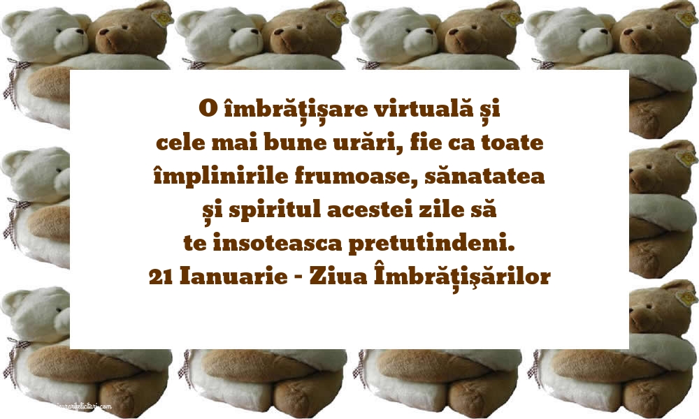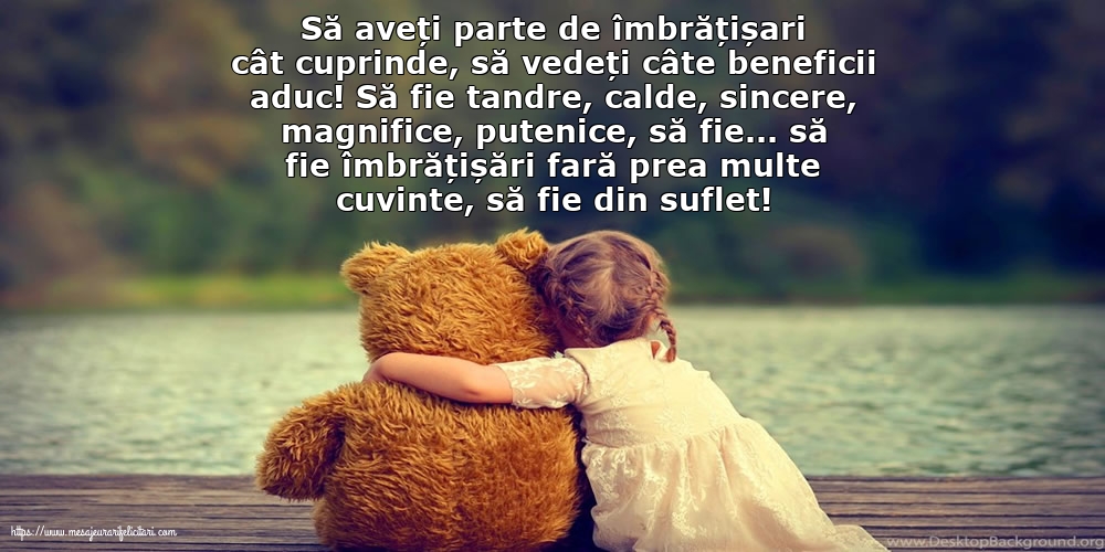Să aveți parte de îmbrățișari cât cuprinde, să vedeți câte beneficii aduc! Să fie tandre, calde, sincere, magnifice, putenice, să fie... să fie îmbrățișări fară prea multe cuvinte, să fie din suflet!