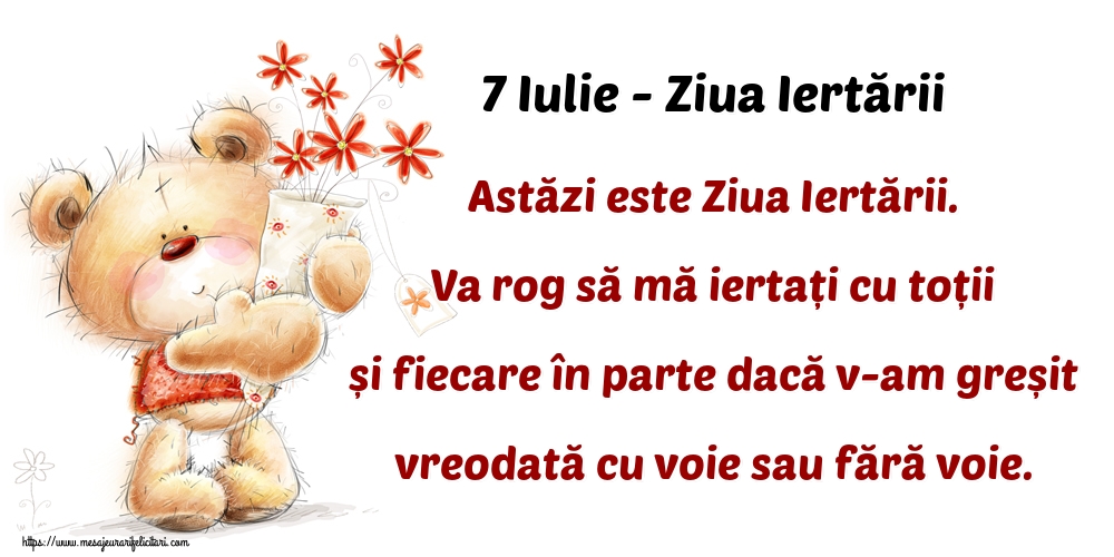 7 Iulie - Ziua Iertării Astăzi este Ziua Iertării. Va rog să mă iertați cu toții și fiecare în parte dacă v-am greșit vreodată cu voie sau fără voie. Felicitari si imagini de Ziua Mondială a Iertării - 7 Iulie.