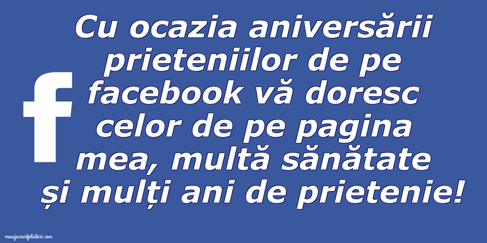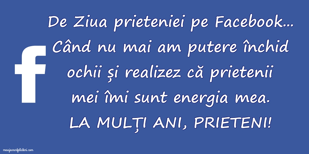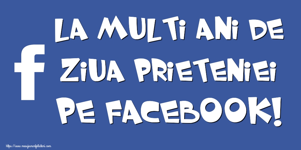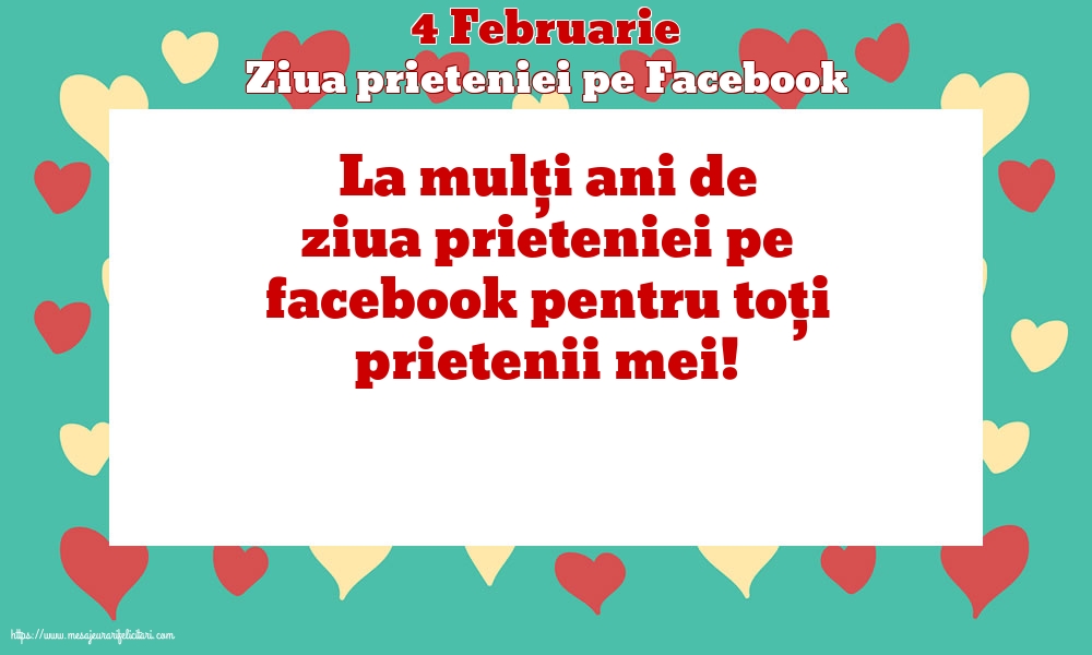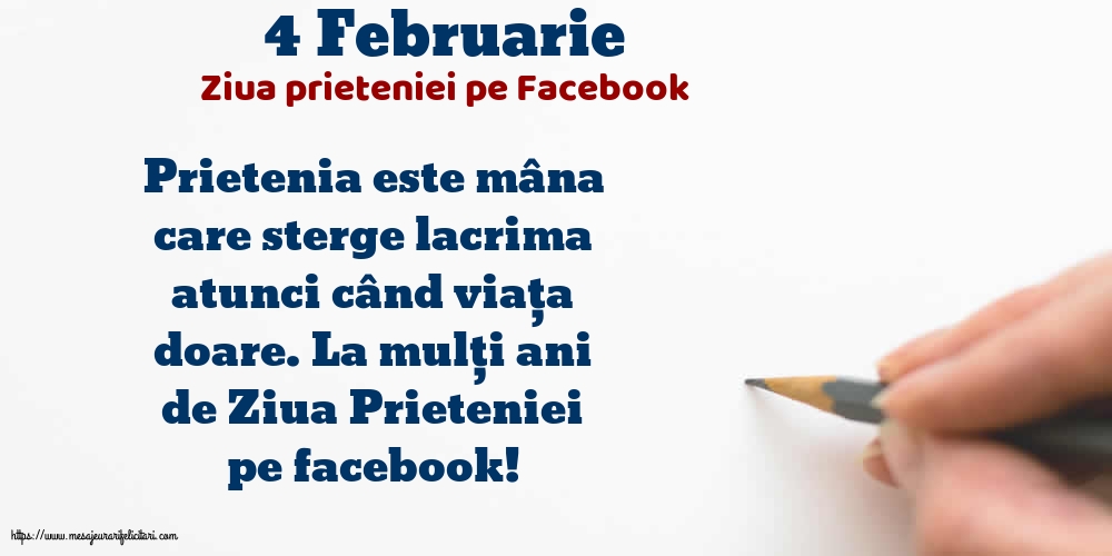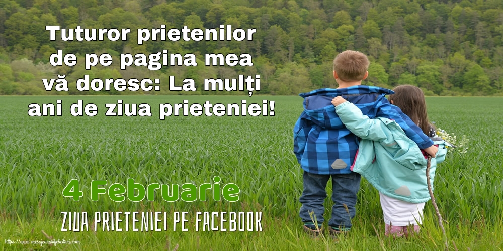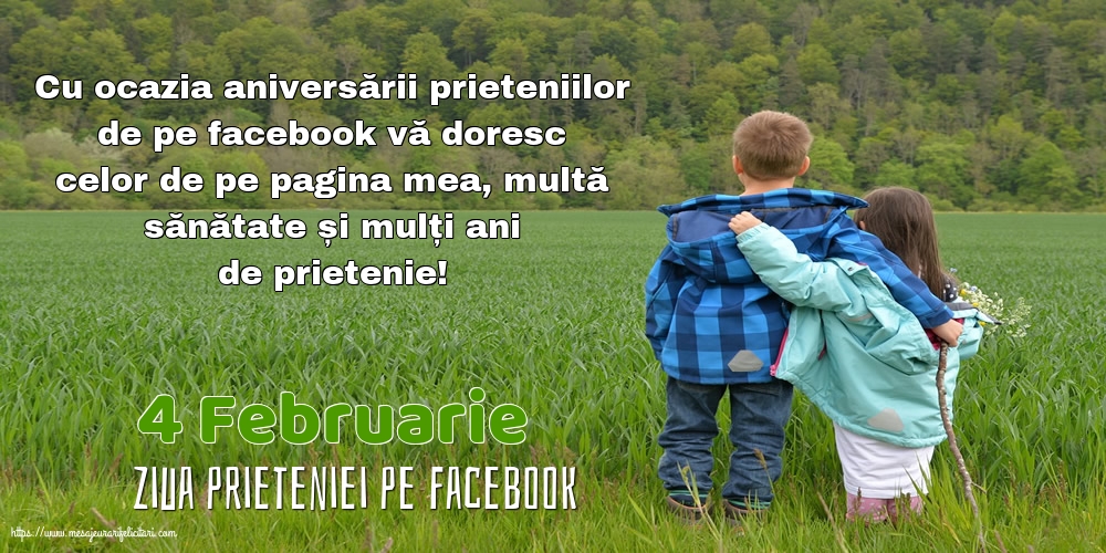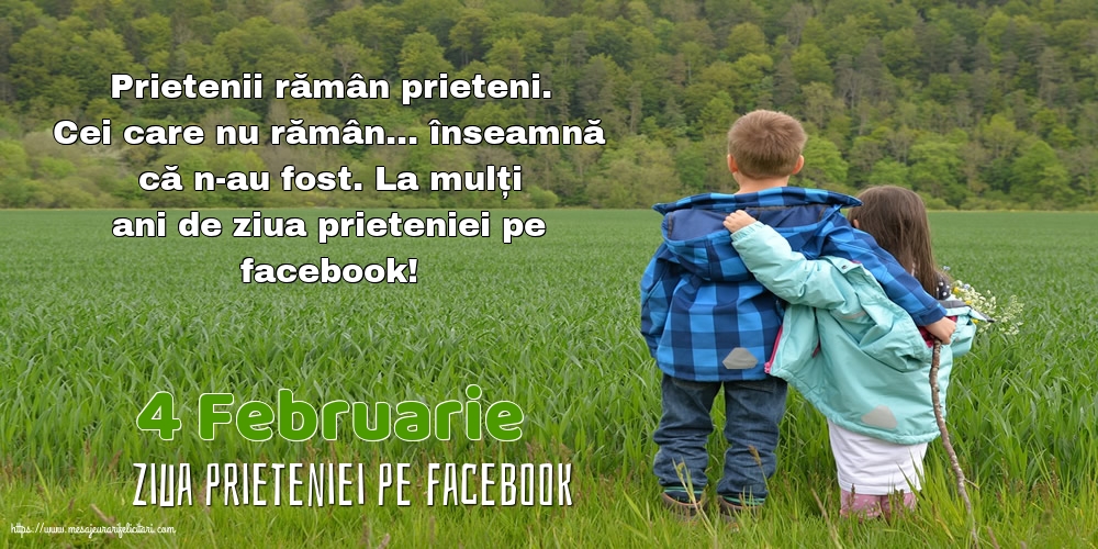 Facebook are ziua de nastere pe pe 4 februarie, iar fondatorul retelei de socializare Mark Zuckerberg propune tuturor utilizatorilor sa sarbatoreasca Ziua Prietenilor in aceasta zi, deci 4 februarie este ziua prieteniei pe facebook. Ziua internationala a prieteniei se sarbatoreste pe 30 iulie, felicitari de Ziua Internationala a prieteniei gasiti aici. De fapt ziua prieteniei trebuie sarbatorita in fiecare zi pentru ca nu exista viata fara prietenie.