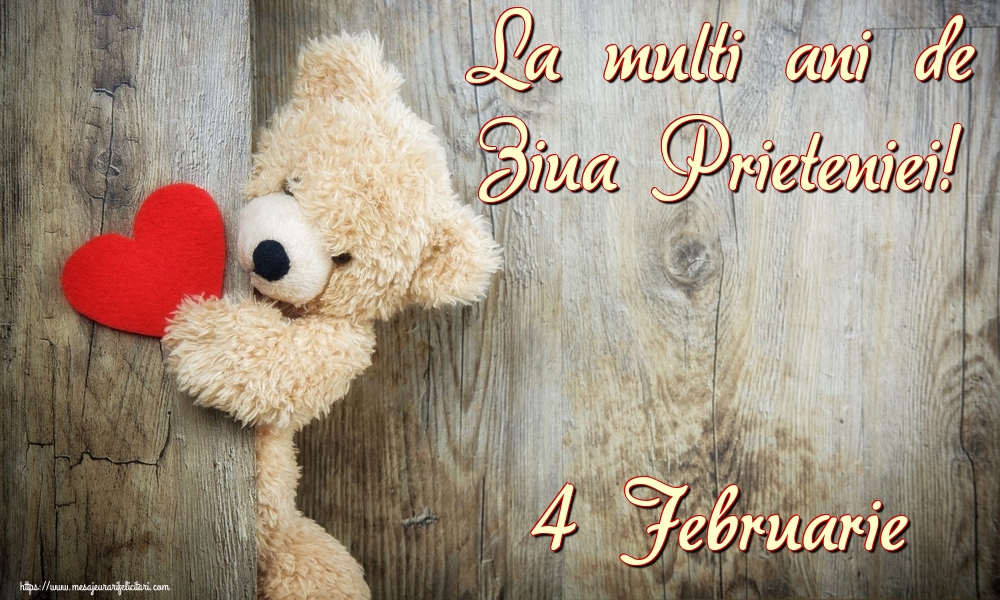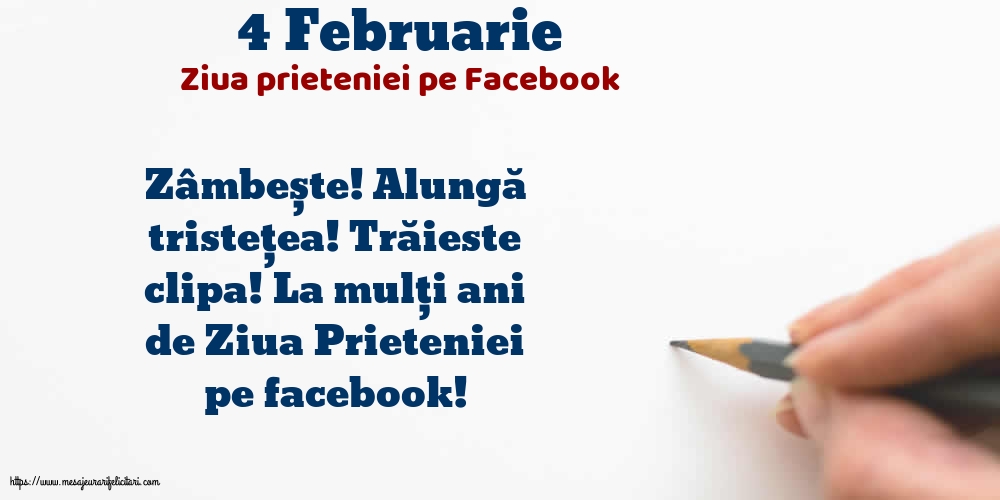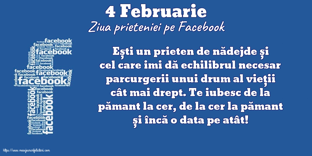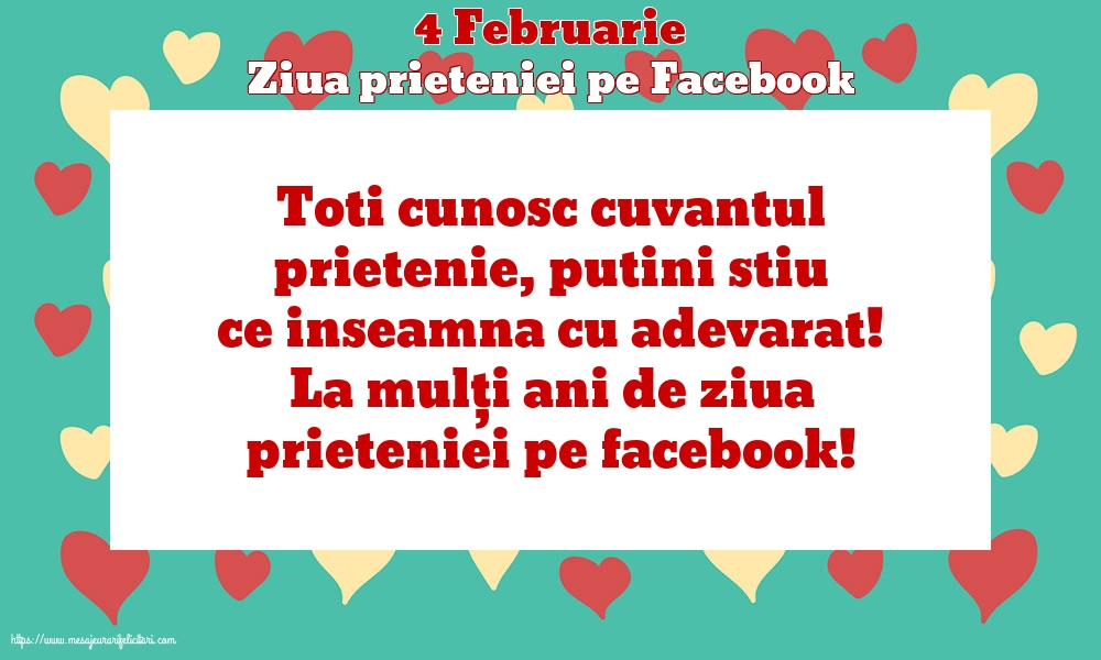 Facebook are ziua de nastere pe pe 4 februarie, iar fondatorul retelei de socializare Mark Zuckerberg propune tuturor utilizatorilor sa sarbatoreasca Ziua Prietenilor in aceasta zi, deci 4 februarie este ziua prieteniei pe facebook. Ziua internationala a prieteniei se sarbatoreste pe 30 iulie, felicitari de Ziua Internationala a prieteniei gasiti aici. De fapt ziua prieteniei trebuie sarbatorita in fiecare zi pentru ca nu exista viata fara prietenie.