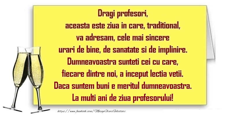 Dragi profesori, aceasta este ziua in care, traditional, va adresam, cele mai sincere urari de bine, de sanatate si de implinire. Dumneavoastra sunteti cei cu care, fiecare dintre noi, a inceput lectia vetii. Daca suntem buni e meritul dumneavoastra. La multi ani de ziua profesorului!