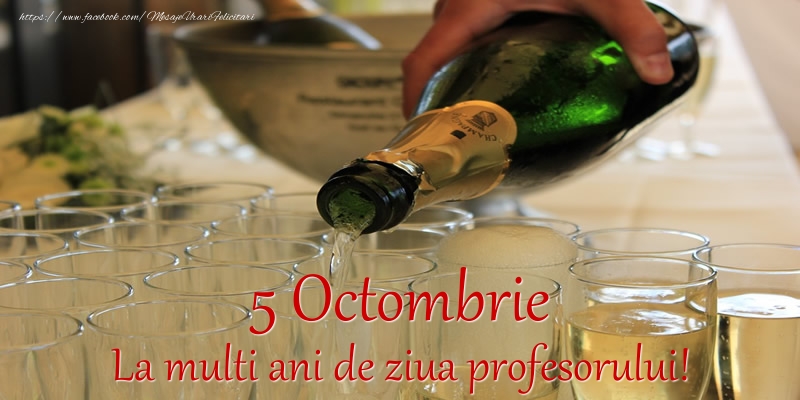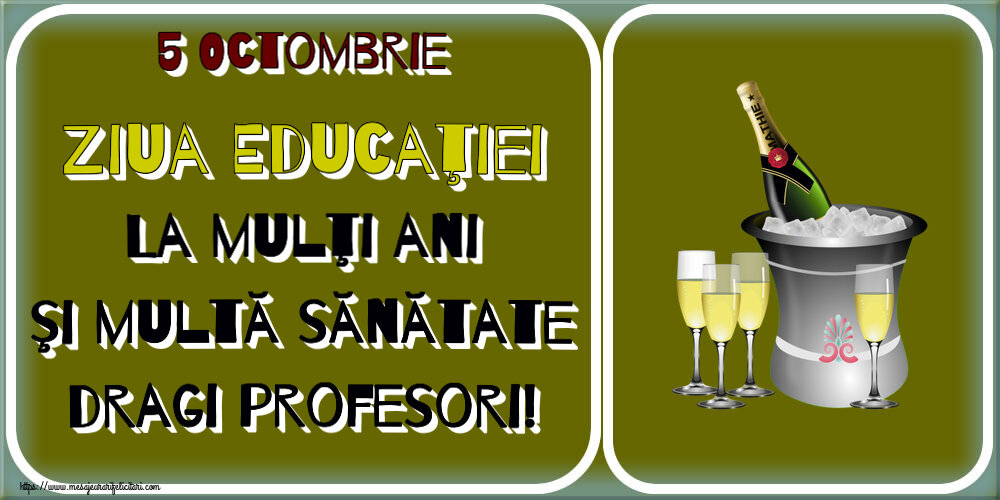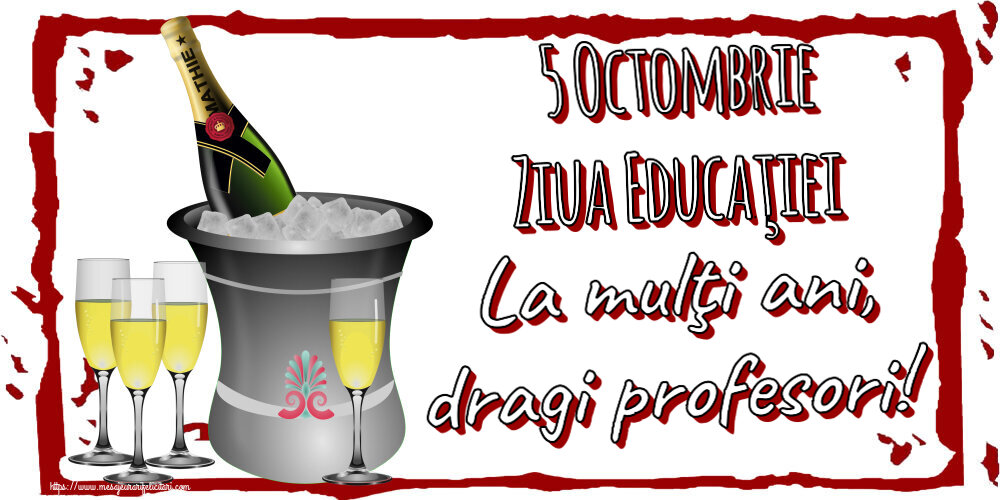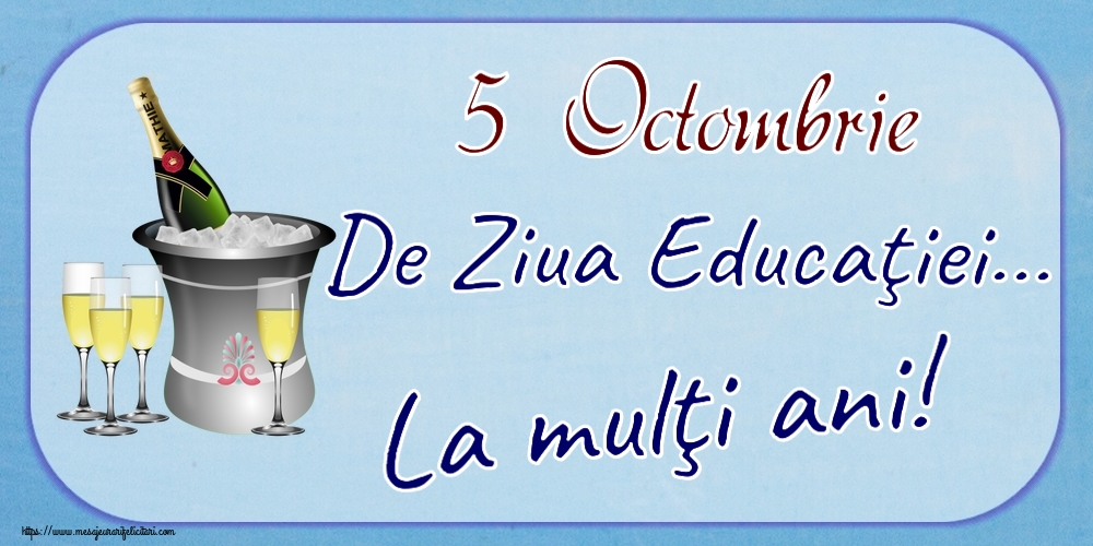 5 Octombrie De Ziua Educaţiei... La mulţi ani! Incepand cu anul 1994, Ziua Internationala a Educatiei este sarbatorita in fiecare an pe 5 octombrie, in intreaga lume, pentru a aminti de importanta rolului educatiei. Aici gasesti cele mai originale felicitari pe care le poti trimite profesorilor sau educatorilor tai! ~ șampanie în frapieră