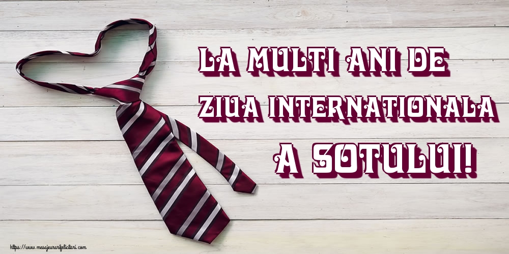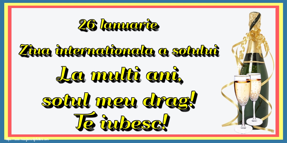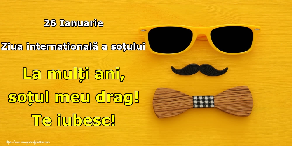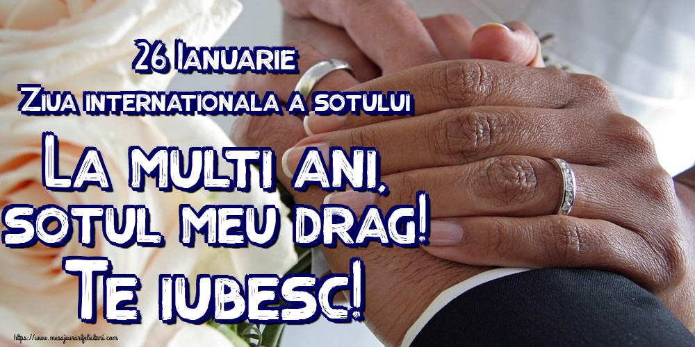 Cu toții știm când este ziua mamei sau a iubitei. Puțini știu că există și o zi internațională a soțului. Ziua internațională a soțului se serbează în fiecare an pe 26 ianuarie. Așadar un bun motiv pentru a vă sărbători partenerul de viață. Puteți să-i oferiți o sticlă de șampanie, să-i pregătiți un tort, să îi rezervați o masă pentru o ieșire cu prietenii... orice ați alege, țineți minte să îi spuneți și 'La mulți ani, soțul meu drag!'.