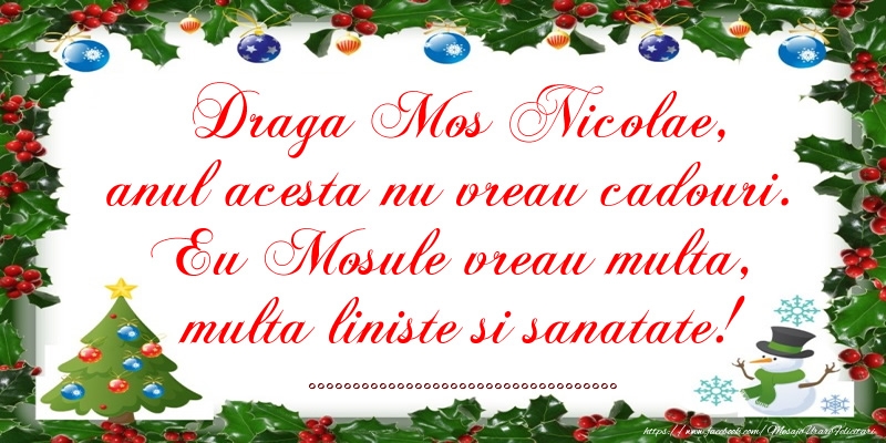 Draga Mos Nicolae, anul asta nu vreau cadouri. Eu vreau multa liniste si sanatate ...]