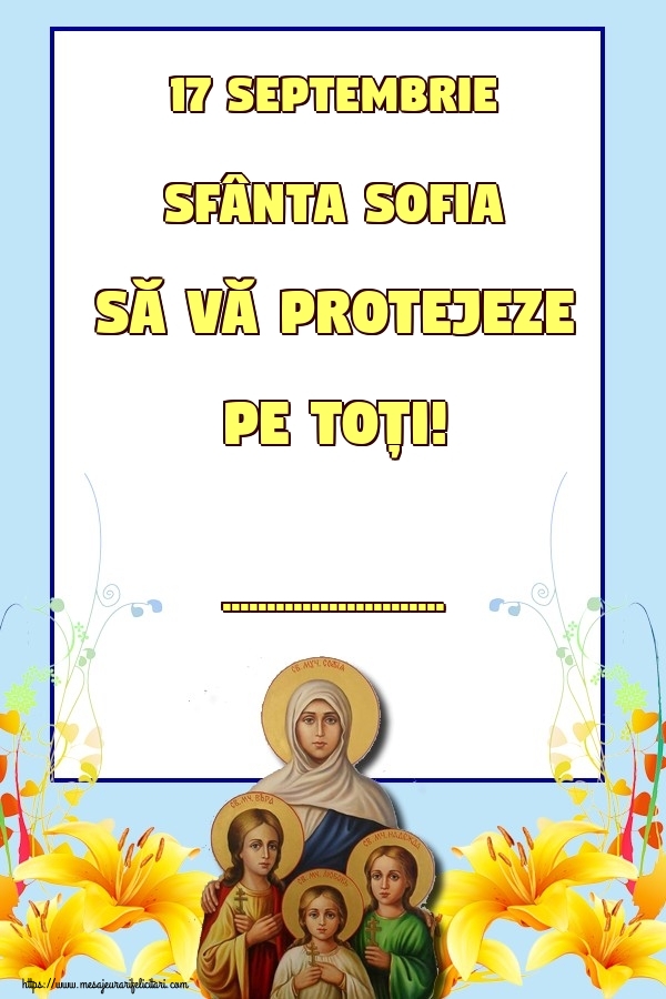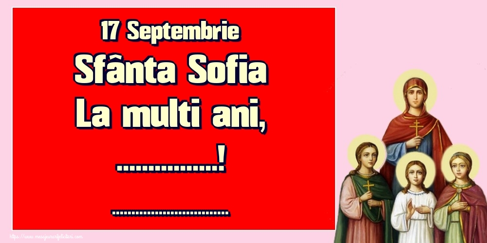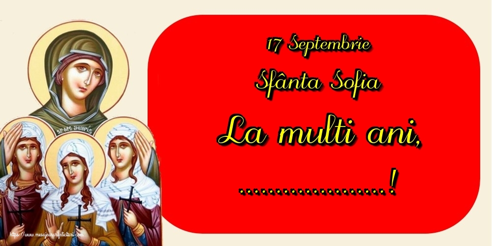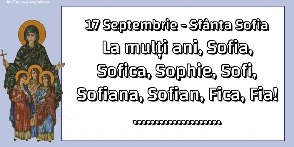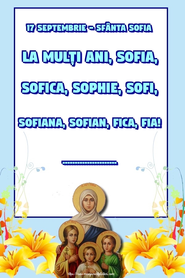 17 Septembrie - Sfânta Sofia La mulți ani, Sofia, Sofica, Sophie, Sofi, Sofiana, Sofian, Fica, Fia! ...