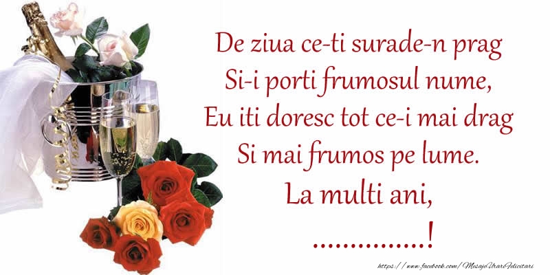 Poezie de ziua numelui: De ziua ce-ti surade-n prag / Si-i porti frumosul nume, / Eu iti doresc tot ce-i mai drag / Si mai frumos pe lume. La multi ani, ...!