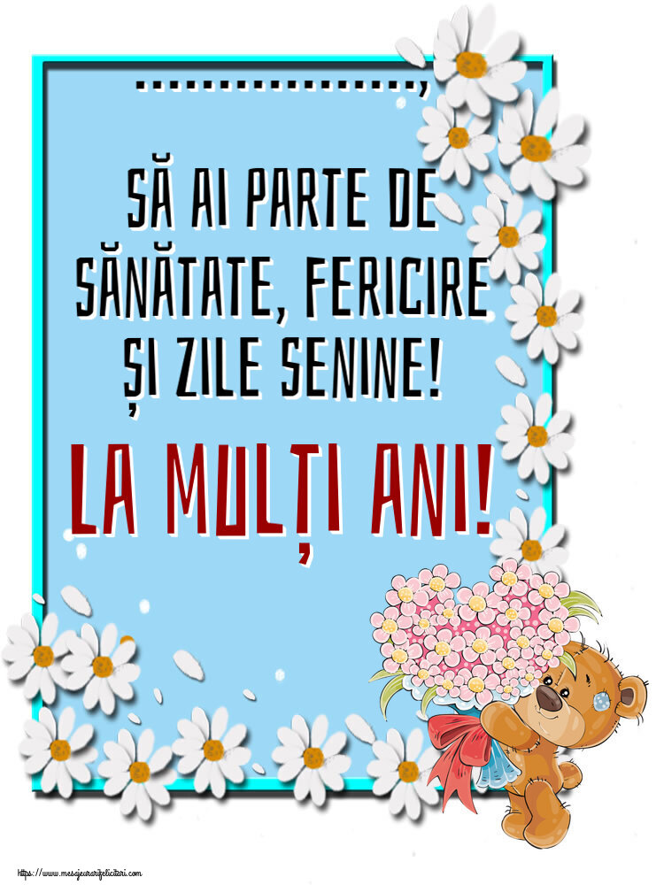 ..., să ai parte de sănătate, fericire și zile senine! La mulți ani! ~ Teddy cu un buchet de flori