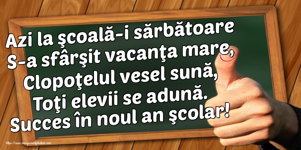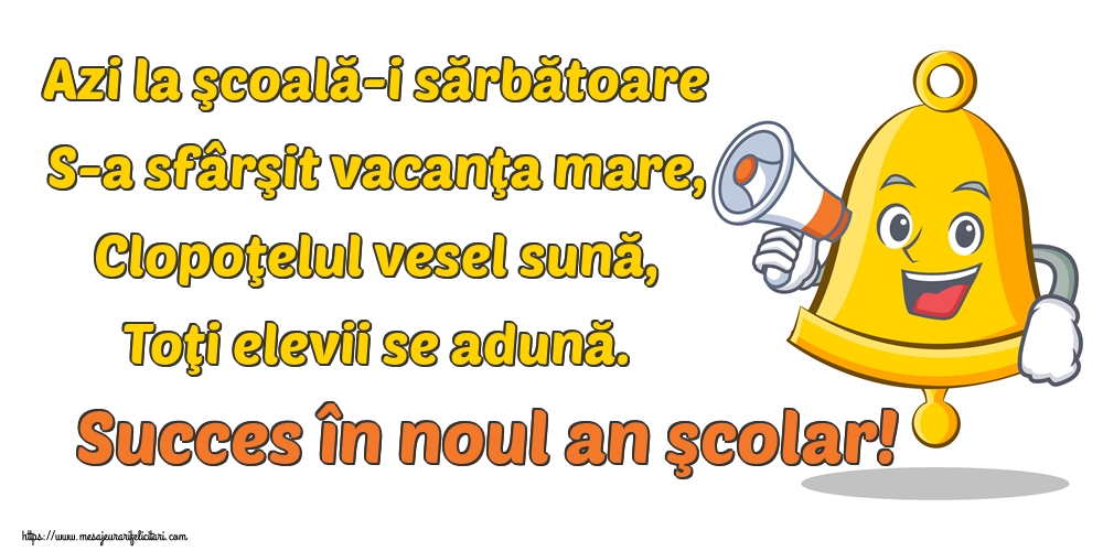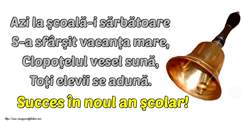 Primul clopoțel, cel care anunța începerea unui nou an școlar, a avut și va avea mereu o însemnătate deosebită pentru fiecare dintre noi, indiferent ca ne referim la elevi, părinți, bunici sau cadre didactice. Prima zi de școală aduce emoție, bucurie, speranță și multe așteptări din orice postura o privim. Mult succes în noul an şcolar!