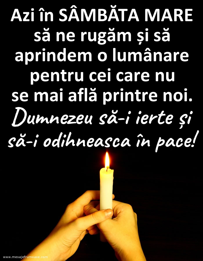 Azi în Sâmbăta Mare să ne rugăm și să aprindem o lumânare pentru cei care nu se mai află printre noi. Dumnezeu să-i ierte și să-i odihneasca în pace!