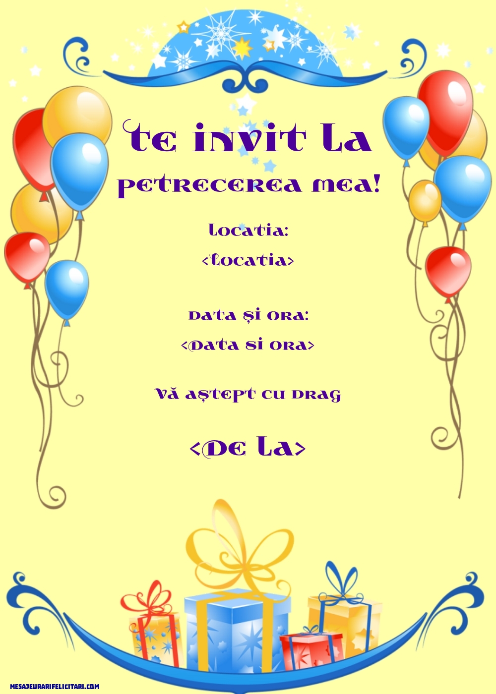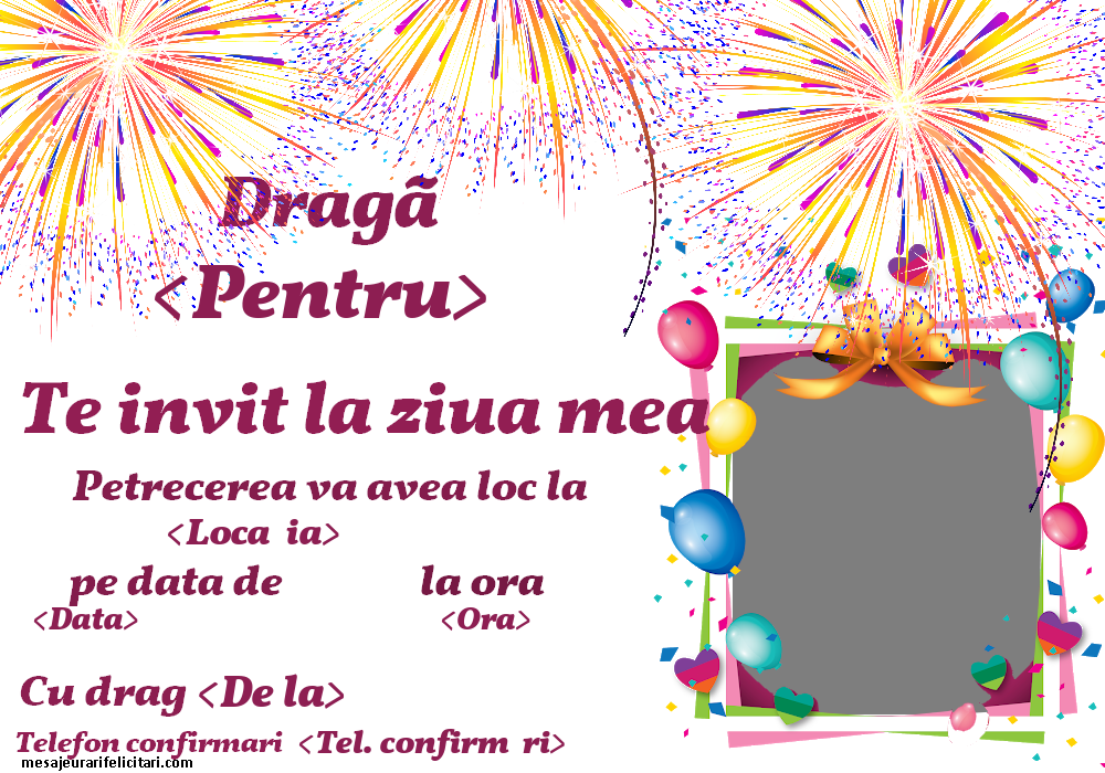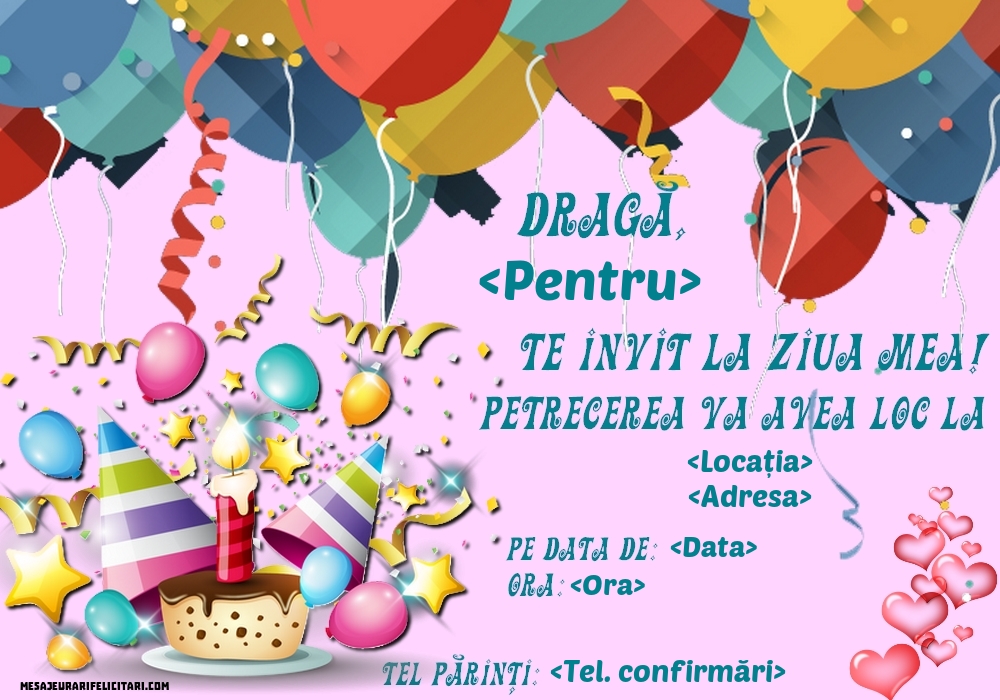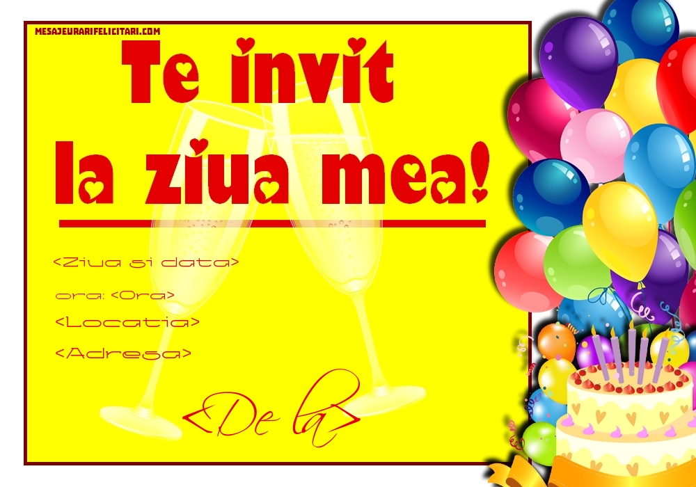 Să înceapă distracţia! Împlinesc __ ani şi acest lucru trebuie sărbătorit cum se cuvine: muzică, dans, mâncare bună şi prietenii mei (printre care te numeri bineînţeles şi tu). Ce mai, cea mai tare petrecere! ______________________________ ______________________________ ______________________________ Vă aştept cu drag, ____________________