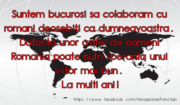 Suntem bucurosi sa colaboram cu romani deosebiti ca dumneavoastra. Datorita unor astfel de oameni Romania poate nutri speranta unui viitor mai bun. La multi ani!