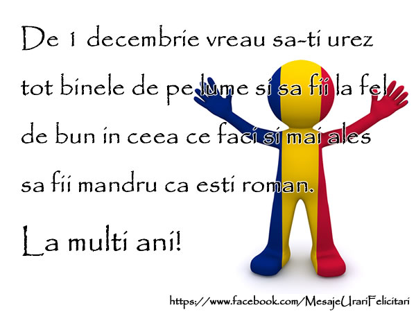De 1 decembrie vreau sa-ti urez tot binele de pe lume si sa fii la fel de bun in ceea ce faci si mai ales sa fii mandru ca esti roman. La multi ani!