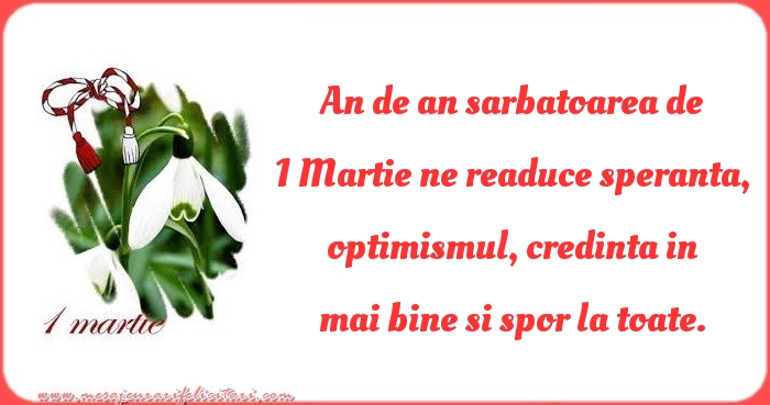 An de an sarbatoarea de 1 Martie ne readuce speranta, optimismul, credinta in mai bine si spor la toate. Din inclestarea frigului cu razele soarelui, a intunericului cu lumina, dupa ultimele zvarcoliri din zilele babelor, invinge viata, primavara, soarele.