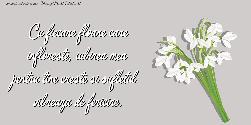 Cu fiecare floare care infloreste, iubirea mea pentru tine creste si sufletul vibreaza de fericire asa cum un fir de ghiocel vibreaza la atingerea razelor soarelui. Te-am iubit... . Te iubesc... . . Si te voi iubi mereu INDIFERENT CAT NE VA FI DE GREU.