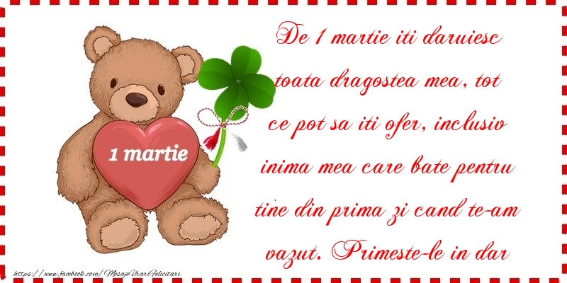 De 1 martie iti daruiesc toata dragostea mea, tot ce pot sa iti ofer, inclusiv inima mea care bate pentru tine din prima zi cand te-am vazut. Primeste-le in dar ...