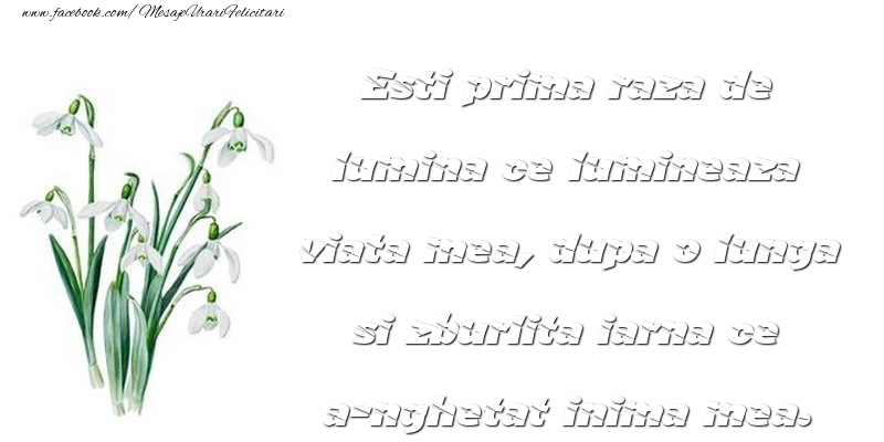 Esti prima raza de lumina ce lumineaza viata mea, dupa o lunga si zburlita iarna ce a-nghetat inima mea. Esti verdele de primavara si cerul infinit brazdat de stele... vino hai vino si te topeste in bratele mele.