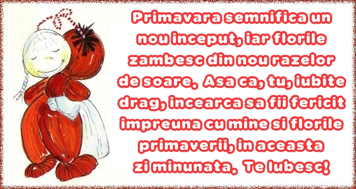 Primavara semnifica un nou inceput, iar florile zambesc din nou razelor de soare. Asa ca, tu, iubite drag, incearca sa fii fericit impreuna cu mine si florile primaverii, in aceasta zi minunata. Te Iubesc!