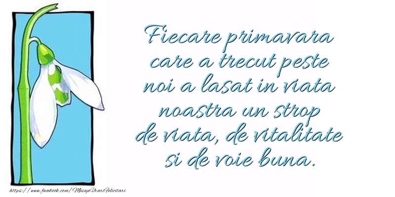 Desi stiam ca primavara este un anotimp inchinat iubirii nu l-am sarbatorit niciodata ca atare. Dar primavara asta este atat de imbietoare, totul renaste si odata cu natura simt renascand si sentimentele mele pentru tine, care sunt mai puternice ca oricand. Fiecare primavara care a trecut peste noi a lasat in viata noastra un strop de viata, de vitalitate si de voie buna. Toate astea nu ar fi insemnat nimic daca nu ai fi fost alaturi de mine. Iti doresc inca o primavara fericita alaturi de mine!