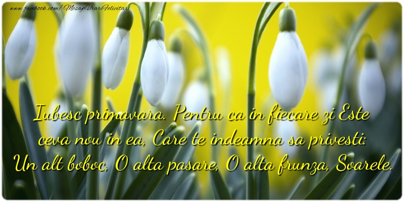 Iubesc primavara. Pentru ca in fiecare zi Este ceva nou in ea, Care te indeamna sa privesti: Un alt boboc, O alta pasare, O alta frunza, Soarele.