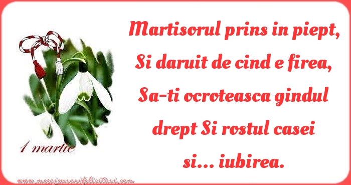 Martisorul prins in piept, Si daruit de cind e firea, Sa-ti ocroteasca gindul drept Si rostul casei si... iubirea.