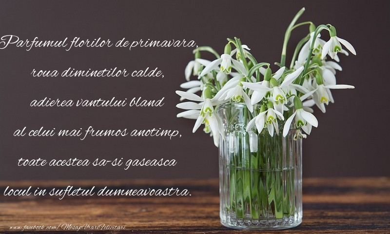 Parfumul florilor de primavara, roua diminetilor calde, adierea vantului bland al celui mai frumos anotimp, toate acestea sa-si gaseasca locul in sufletul dumneavoastra.