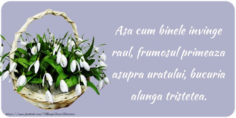 Asa cum binele invinge raul, frumosul primeaza asupra uratului, bucuria alunga tristetea, tot asa primavara din sufletele noastre topeste povara grea de nea si lasa sa se iveasca primul ghiocel, simbol al feminitatii eterne.