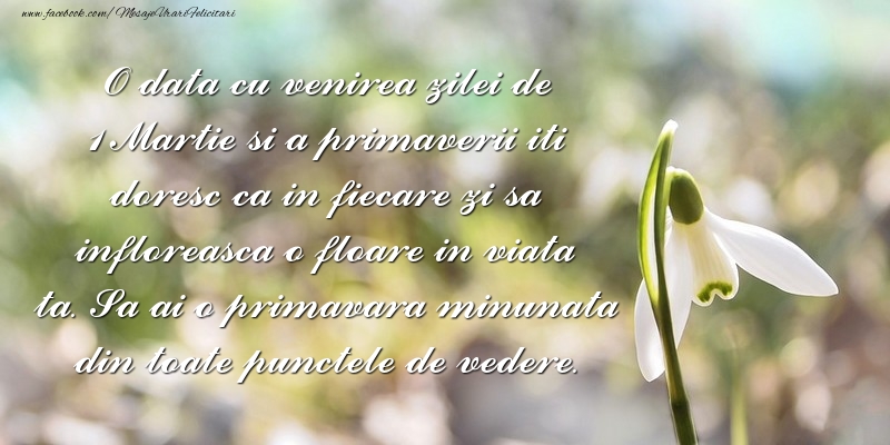 O data cu venirea zilei de 1 Martie si a primaverii iti doresc ca in fiecare zi sa infloreasca o floare in viata ta. Sa ai o primavara minunata din toate punctele de vedere.