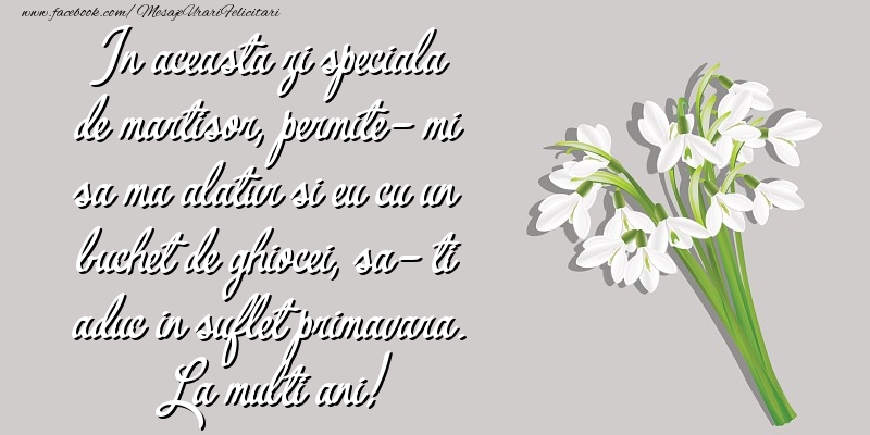 In aceasta zi speciala de martisor, permite-mi sa ma alatur si eu cu un buchet de ghiocei, sa-ti aduc in suflet primavara. La multi ani!