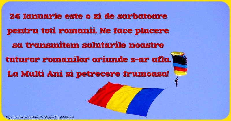 24 Ianuarie este o zi de sarbatoare pentru toti romanii. Ne face placere sa transmitem salutarile noastre tuturor romanilor oriunde s-ar afla. La Multi Ani si petrecere frumoasa!
