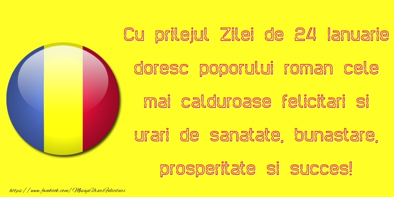 Cu prilejul Zilei de 24 Ianuarie doresc poporului roman cele mai calduroase felicitari si urari de sanatate, bunastare, prosperitate si succes!