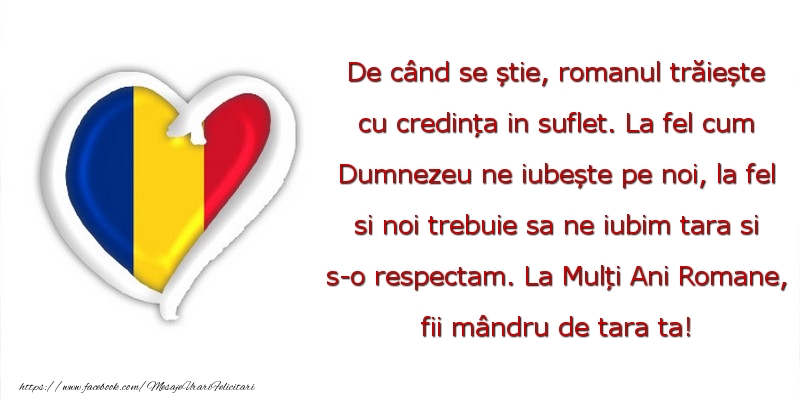 De când se știe, romanul trăiește cu credința in suflet. La fel cum Dumnezeu ne iubește pe noi, la fel si noi trebuie sa ne iubim tara si s-o respectam. La Mulți Ani Romane, fii mândru de tara ta!