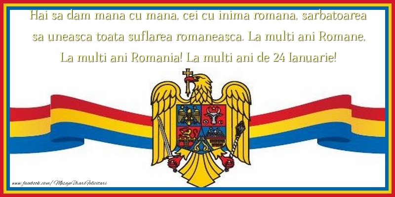 Hai sa dam mana cu mana, cei cu inima romana, sarbatoarea sa uneasca toata suflarea romaneasca. La multi ani Romane, La multi ani Romania! La multi ani de 24 Ianuarie!