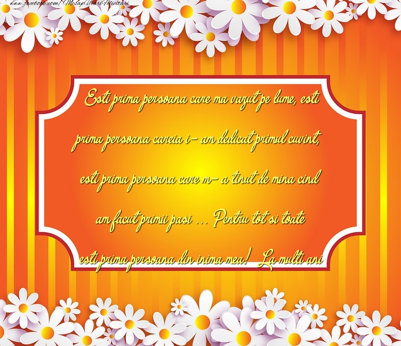 Esti prima persoana care ma vazut pe lume, esti prima persoana careia i-am dedicat primul cuvint, esti prima persoana care m-a tinut de mina cind am facut primii pasi, esti prima persoana care a stat langa mine cind m-am dus prima zi la scoala, esti prima persoana care suna doctorul cind ma imbolnaveam... Pentru tot si toate esti prima persoana din inima mea! La multi ani de 8 Martie mama!