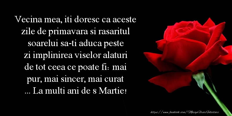 Vecina mea, iti doresc ca aceste zile de primavara si rasaritul soarelui sa-ti aduca peste zi implinirea viselor alaturi de tot ceea ce poate fi: mai pur, mai sincer, mai curat ... La multi ani de 8 Martie!