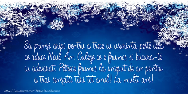 Sa prinzi aripi pentru a trece cu usurinta peste ceea ce aduce Noul An. Culege ce e frumos si bucura-te cu adevarat. Petrece frumos la inceput de an pentru a trai senzatii tari tot anul! La multi ani!