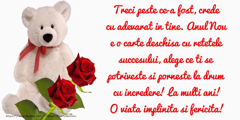 Treci peste ce-a fost, crede cu adevarat in tine. Anul Nou e o carte deschisa cu retetele succesului, alege ce ti se potriveste si porneste la drum cu incredere! La multi ani! O viata implinita si fericita!