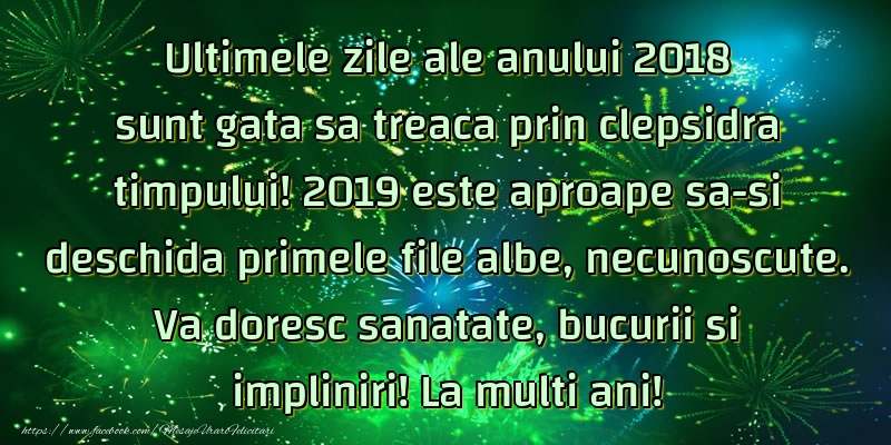Ultimele zile ale anului 2018 sunt gata sa treaca prin clepsidra timpului! 2019 este aproape sa-si deschida primele file albe, necunoscute. Va doresc sanatate, bucurii si impliniri! La multi ani!