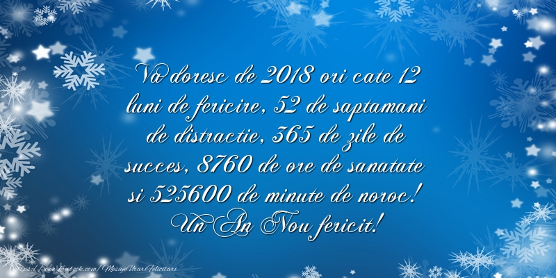 Va doresc de 2018 ori cate 12 luni de fericire, 52 de saptamani de distractie, 365 de zile de succes, 8760 de ore de sanatate si 525600 de minute de noroc! Un An Nou fericit!