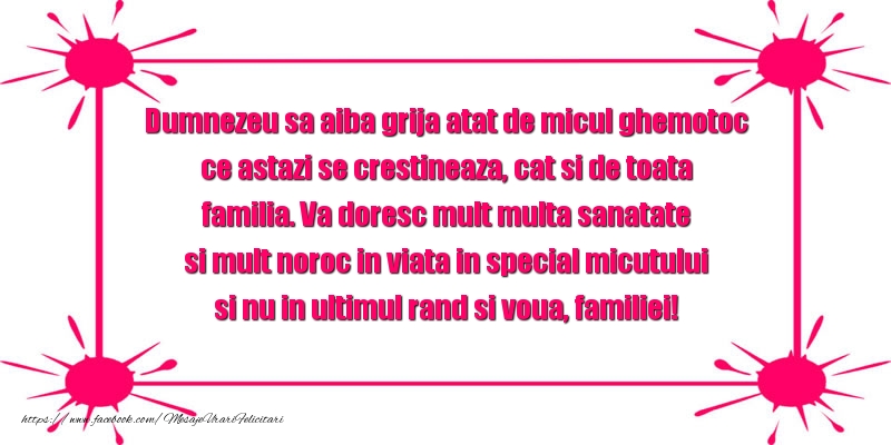 Dumnezeu sa aiba grija atat de micul ghemotoc ce astazi se crestineaza, cat si de toata familia. Va doresc mult multa sanatate si mult noroc in viata in special micutului si nu in ultimul rand si voua, familiei!