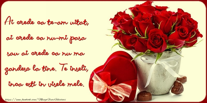 Ai crede ca te-am uitat, ai crede ca nu-mi pasa sau ai crede ca nu ma gandesc la tine. Te inseli, inca esti in visele mele.
