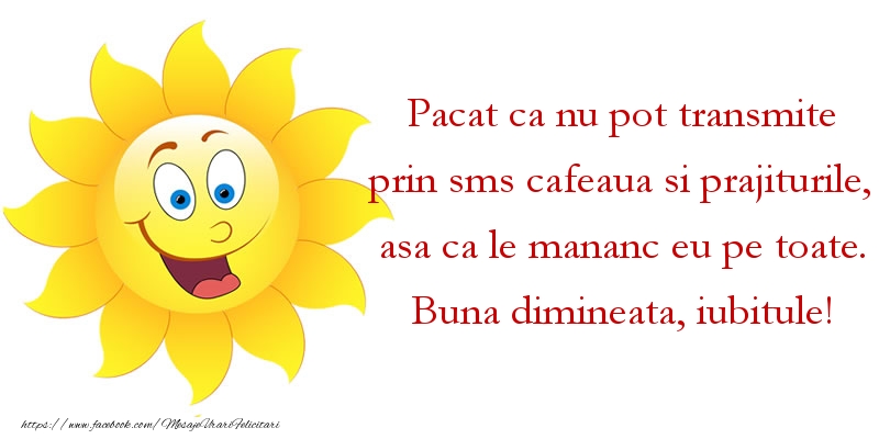 Pacat ca nu pot transmite prin sms cafeaua si prajiturile, asa ca le mananc eu pe toate. Buna dimineata, iubitule!