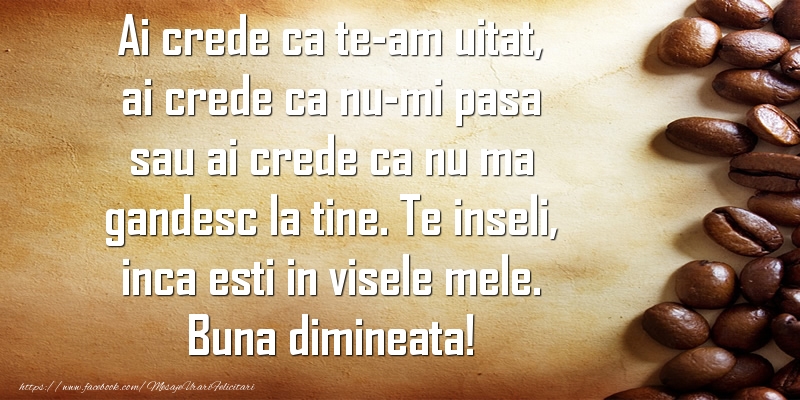 Ai crede ca te-am uitat, ai crede ca nu-mi pasa sau ai crede ca nu ma gandesc la tine. Te inseli, inca esti in visele mele. Buna dimineata!