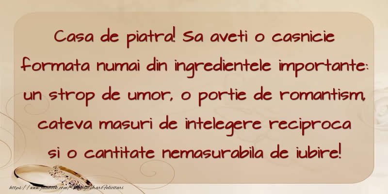 Casa de piatra! Sa aveti o casnicie formata numai din ingredientele importante: un strop de umor, o portie de romantism, cateva masuri de intelegere reciproca si o cantitate nemasurabila de iubire!